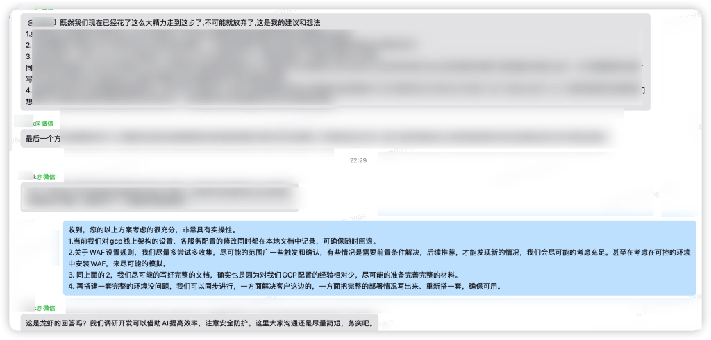 和客户在群里讨论问题,对方项目经理提出5条建议,1,2,3,4,5。
